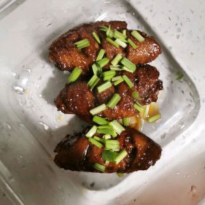 最后大火收汁 捞出鸡翅 让后自己种的蒜苗进行点缀,如果有白芝麻,也可以点缀。