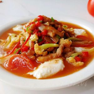 看情况补料调整下味道,完事儿撒上把青红椒淋两圈水淀粉进去把汤汁收浓些