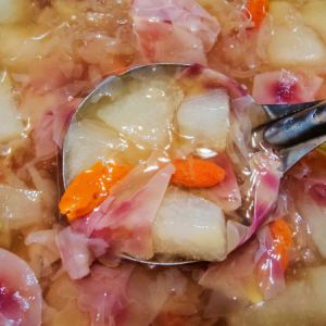 放入雪梨丁,中火煮搅拌一下注意水溢出,雪梨没有白芯即可;