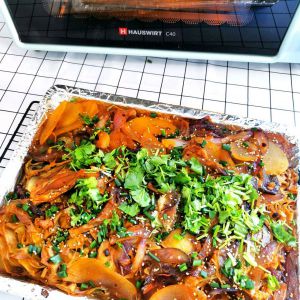 煮好的配菜浇在鱼身上,放入烤箱中下层,220°烘烤15分钟,出炉撒香菜芝麻葱花,酱香烤鱼就完成了㊙️