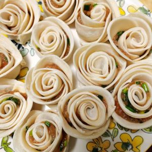 饺子皮叠加排队,中间均匀抹上肉馅。