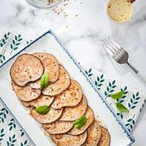 烹饪结束,取出莲藕,放凉后切片装盘,淋上糖桂花即可食用。