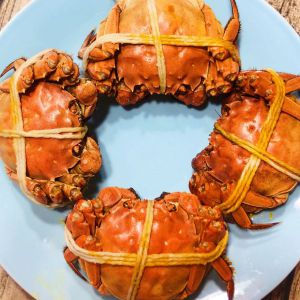 每只蟹底下垫两片姜片,蟹上也铺两片姜片(注意把蟹反着放,避免膏黄漏出)调中火清蒸15到20分钟,时间根据蟹的大小而定