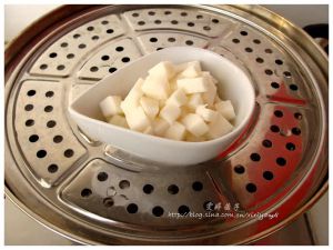先将山药切成丁,放入蒸锅蒸制10分钟。