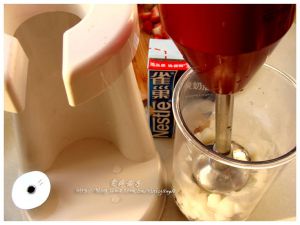将搅拌机放入杯中搅拌并加入淡奶油。