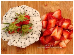 将火龙果切成丁,草莓切成小块备用。