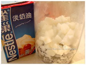 将蒸熟的山药和火龙果一起放入搅拌机的杯中。