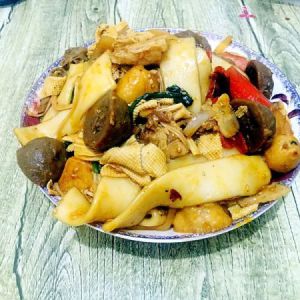 将焯烫好的肥羊粉,干豆腐,腐竹,金针磨倒入锅中翻炒均匀,使化开的火锅底料均匀的布满菜和肉