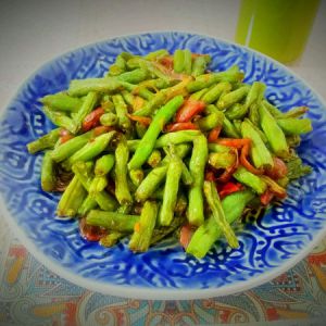 待芸豆炒至发绿,加入花椒蒜末辣椒葱丝,继续煸炒。