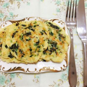 菠菜用水焯一下。菠菜、胡萝卜、香菇切碎。