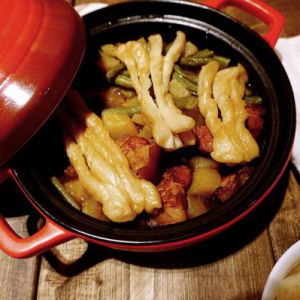 无论用塔吉锅还是高压锅,土豆炖一下以后就把整锅倒回到炒菜锅中。将刚才的卷子拉长平铺到红烧肉上面。如果觉得水少,可以适当加一点。水开后盖盖,转小火继续焖煮。