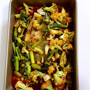 烤鱼的时候,我们来把花菜用剪刀剪成小块儿清洗干净,蒜瓣切片,生姜切成块儿,干辣椒切成段儿,葱和芹菜洗净切成段儿,花椒一小撮备用!
