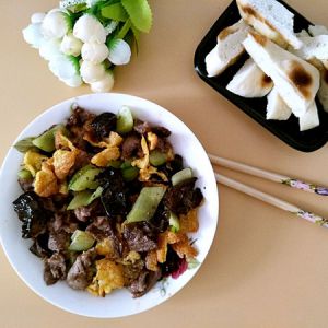 出锅。 个人觉得,牛肉的香嫩渗透着蛋香,又有一股黄瓜的青涩,非常好吃。(不好吃,你打我。哈哈