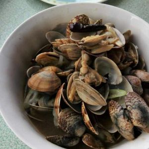 花蛤吐沙。在清水中放入大量的盐,静止放置,这样花蛤就会吐沙了。