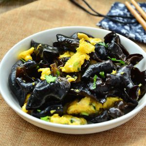 再次加油烧热,加入葱花炒香,将木耳加入,调入盐、酱油翻炒,炒木耳时容易崩,一定小心