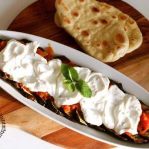 用一个大盘子,第一层铺茄子,第二层放西红柿酱,第三层放酸奶,最后点缀薄荷叶就完成了