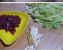 圆白菜洗净,切丝;猪瘦肉切丝,加料酒、淀粉,抓匀。葱切丝,姜切丝。