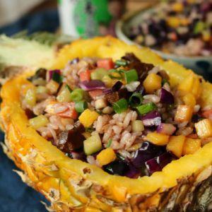挖出那大半个菠萝的果肉,外壳用来当容器。