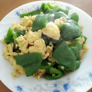 锅内留油放入青椒,生抽耗油以及少许盐,快速翻炒,放入鸡蛋
