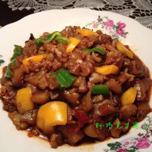 锅中少许的油热后,加葱姜蒜沫炒香,再加入一大汤匙陴县豆瓣酱炒出香味并出红油,将茄子倒进锅中翻炒,放入少量醋和糖,待茄子入味后,加入青椒和黄椒出锅