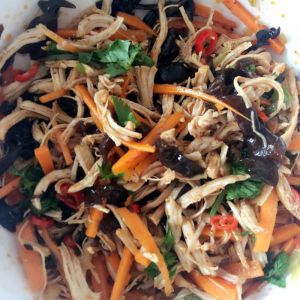 热锅放油,把葱,蒜,辣酱,生姜放热油里炒一下,这样更香,之后倒入鸡丝里