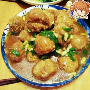 瘦肉+鱼肉+泡好的糯米,一起剁好。(可用绞肉机)为了奶奶的红烧狮子头,用了纯手工剁,花时1个小时。放入调料,揉匀。做成小丸子,放入费油中炸熟金黄。