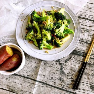 倒入西兰花,加入盐、料酒、蚝油、糖、鸡精翻炒,少量水