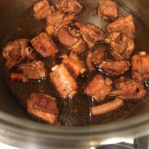 排骨倒入压力锅加水没过排骨 再倒适量生抽加适量的盐 不要太多因为酱油就够咸了 后面还要加老抽调色 开火 上气八分钟左右关火