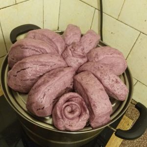 把紫薯加入面粉,加水搅拌均匀,发效一个半小时,