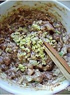 肉馅加入料酒,生抽,色拉油和鸡精,加入葱和姜,打入两大勺的花椒水,顺一个方向搅打上劲,最后加入一点盐搅匀