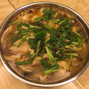 热油,放(花生油或者辣椒油)再次加入花椒一起爆香后,油就撒在香葱,香菜上,这酸菜鱼就大功告成了。