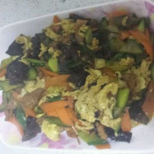 先到入胡萝卜、木耳翻炒一下,然后倒入黄瓜(因为黄瓜倒早了就不好吃不脆了)放半小勺盐,用铲子翻炒几下,最后倒入炒好的鸡蛋在翻炒几下,倒入蔬菜精炒匀,大功告成盛入盘中