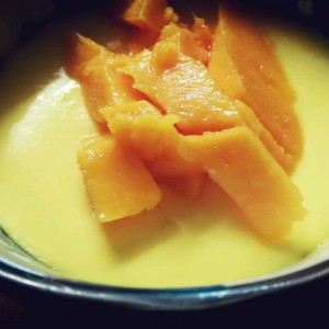 布丁蒸好,摆上芒果,最后可加一点点的蜂蜜。儿子不喜欢蜂蜜太多,所以我摆的不多。