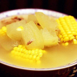 玉米砍成大约4cm的小段。冬瓜切约3cm的块备用。