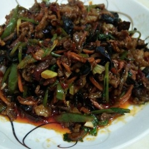 加入肉丝翻炒,然后倒入碗汁,放入香菜