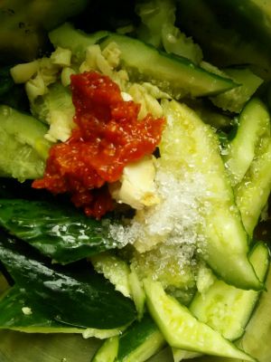 青瓜装碗,下香油,盐,白糖,陈醋,蒜蓉和辣椒酱,盖上盖子扣一下。