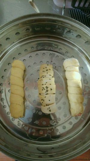 做好的香肠卷码放锅中,每个之间都留一些空隙,盖上盖子蒸十五分钟就可以啦…喜欢的可以放些芝麻在上面哦
