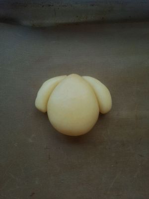取一块原色面团搓成水滴状。然后搓两条细的粘在两边做耳朵。