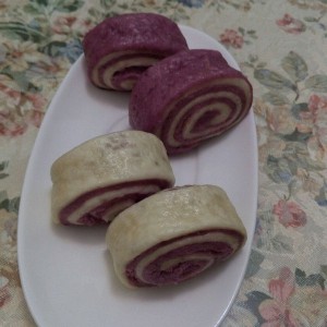 余下面粉加入5克左右酵母用牛奶拌面团!揉到表面光滑!二个面团一起放烤箱发酵40分钟左右吧!烤箱中放碗热水!具体时间我没仔细看!那会在给女儿做双皮奶和炒菜!呵呵自己估计吧!面团差不多二倍大左右!我是吃完饭收拾在弄的!取出来如图这样分成同重的4个面团!我是紫的350*2!白色的400*3!我材料没具体称过.自己做来看的.