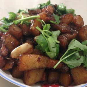 炒糖色,依次加入调味料,肉丁,加入适量盐,放点土豆丁也行,放入老抽生抽,最后加入水漫过肉,炖至土豆绵软,肉也绵软,