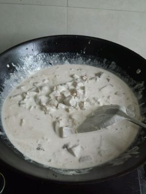 芋头煮一会后熄火!立即把调好的粘米粉浆全部倒进锅中。