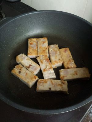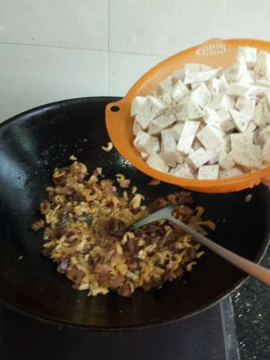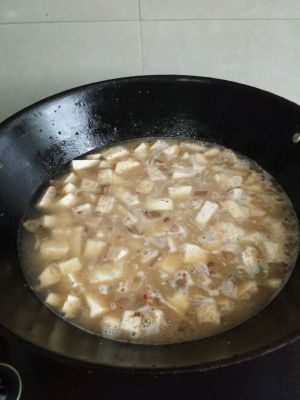 腊肉、虾米放锅中加入盐、糖、料酒、胡椒粉,炒香!再加入芋头粒炒几下!