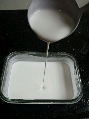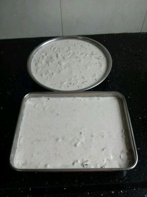 把搅拌好芋头浆倒入糕盘中,这个量是可以装入25cmx20cmx5cm的糕盘2盘。