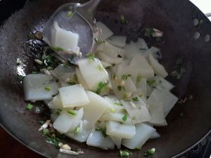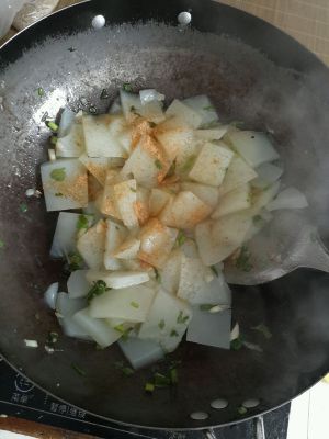 倒入凉粉片,大火进行翻炒。