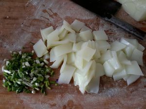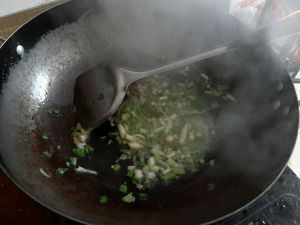 油热后放入切好的葱花及部分蒜苗梗,爆香。