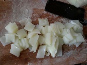 一手扶凉粉块儿,一手将其切成均匀的长宽如麻将块的片状,约3mm厚即可。
