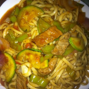 锅中油热后先滑炒牛里脊断生,改大火蒜爆香,下入青椒炒香,倒入全部配菜。加入盐 耗油 酱油 番茄酱调味。加入适当水,开后加入适当醋,放入面条,小火焖煮1分钟 加入胡椒翻炒均匀