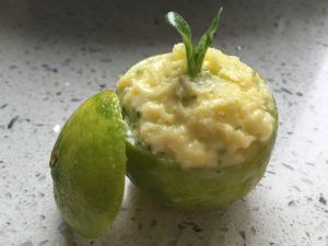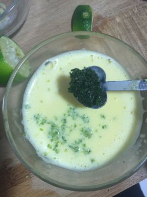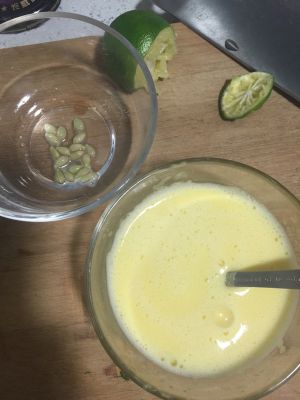 待混合蛋液微冷却后倒入3/4的青柠汁搅拌均匀