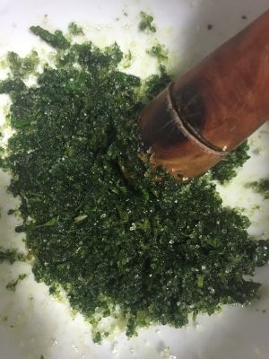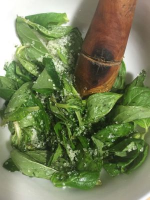 放一勺白砂糖,用小木锤将薄荷叶捣碎(不可提前用刀切哦,不然薄荷叶的倾向无法很好的混合散发出来)