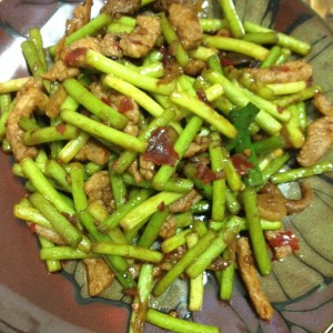 放入蒜苔,倒入生抽,加入少许糖,翻炒片刻,最后加入盐。还可以勾芡收汁。即可出锅。